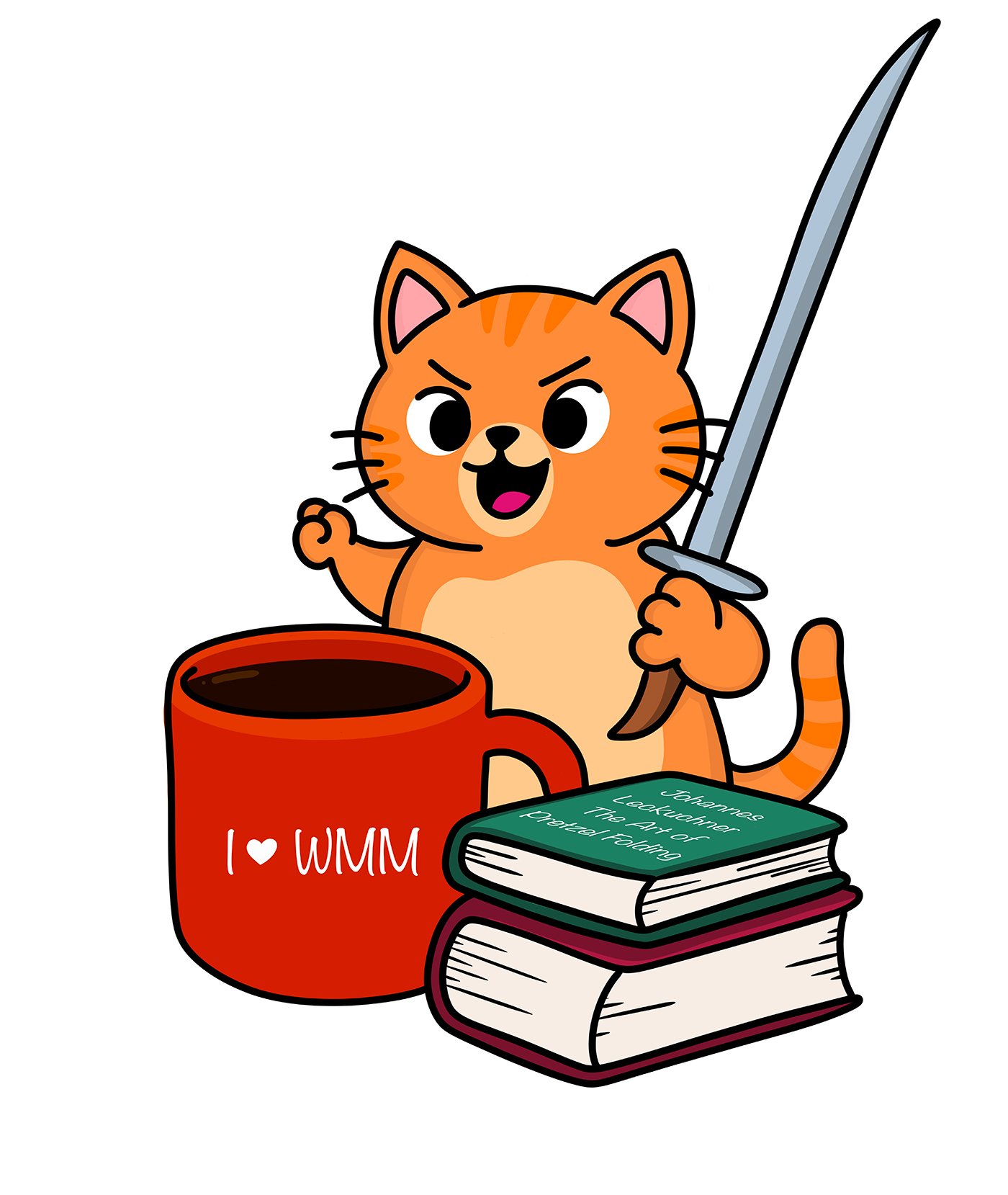 Wiener Messer Melange 2026This illustration was created for Wiener Messer Melange 2026, a HEMA event dedicated to the study and practice of the Langes Messer. The brief was to create a quirky illustration featuring the Wapenpaws cat character interacting with the world of Messer fencing.